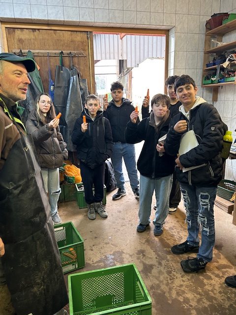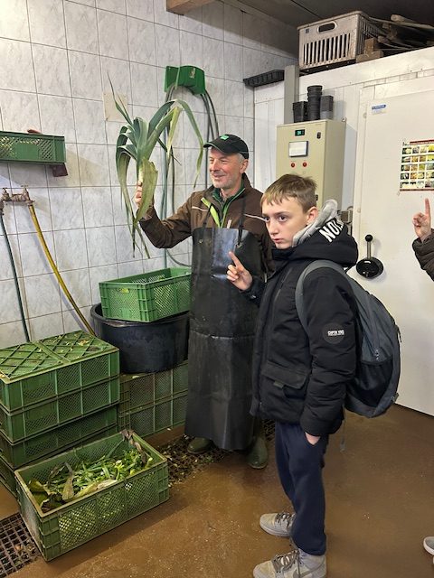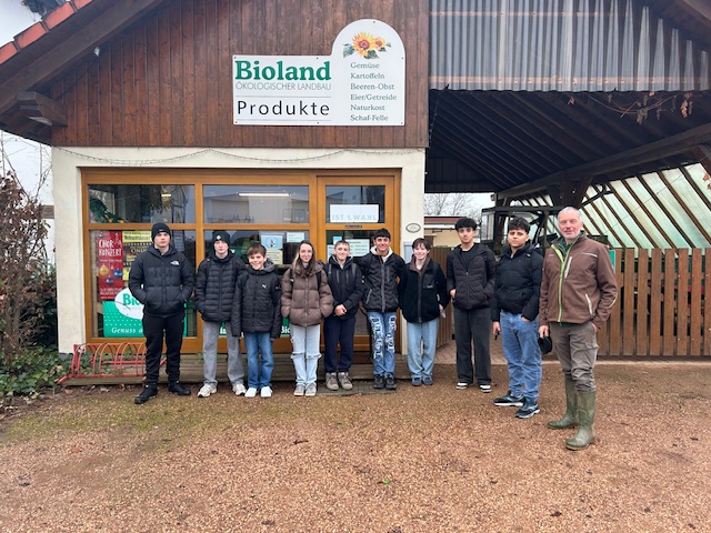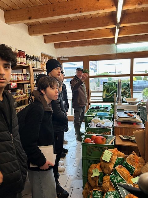 Der Landwirt führte die Schülerinnen und Schüler zunächst durch das Gemüselager und stellte die dort gelagerten regionalen Gemüsesorten vor. Anschließend erklärte er anschaulich die Grundprinzipien der ökologischen Landwirtschaft und zeigte, wie nachhaltig und ressourcenschonend der Betrieb arbeitet.