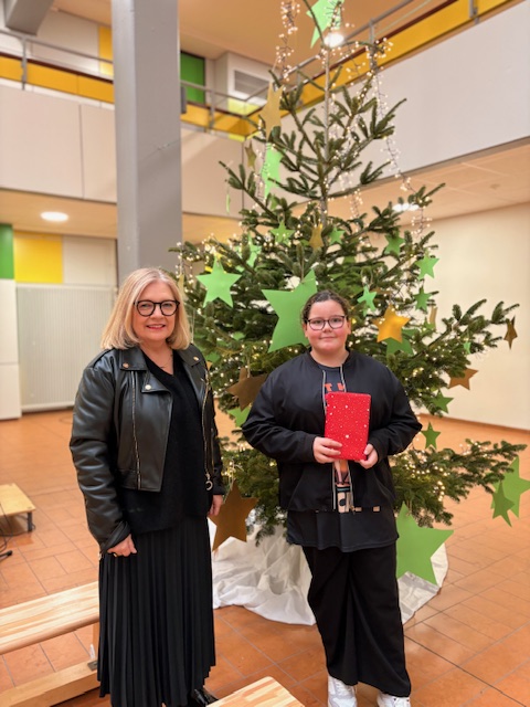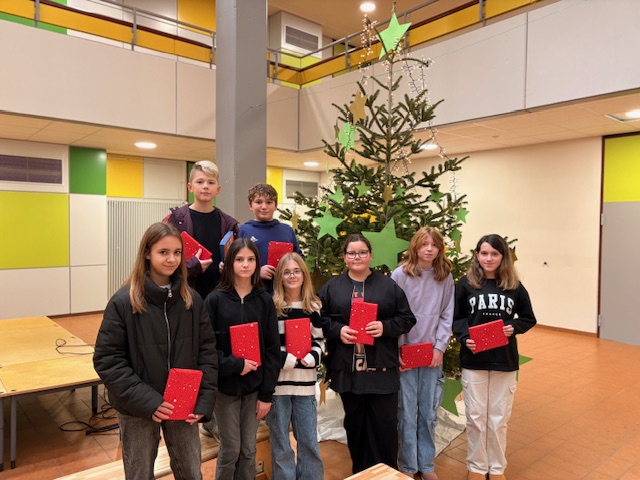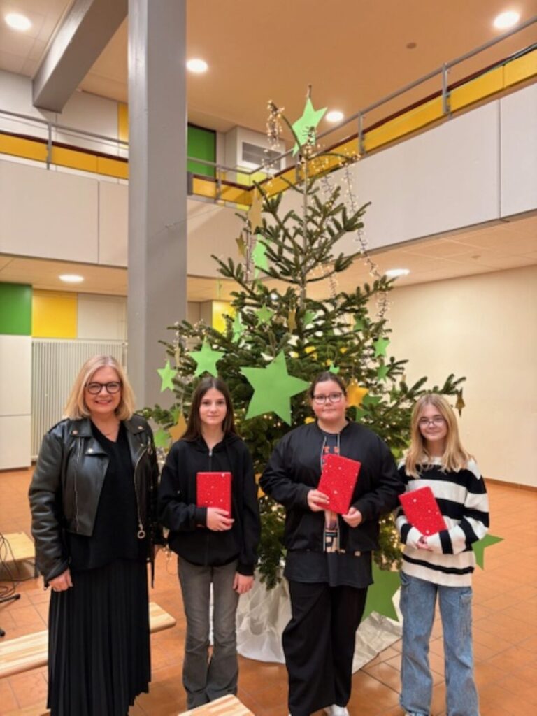 Am 11.Dezember 2025 fand der diesjährige Vorlesewettbewerb der Klassenstufe 6 statt. In den letzten Wochen haben sich die Schüler und Schülerinnen mit ihren Deutschlehrerinnen, Frau Schleidowitz, Frau Lehnert, Frau Heintz und Frau Staudt ganz intensiv auf dieses schon zur Tradition gewordene Ereignis vorbereitet. Lesekisten wurden kreiert sowie Präsentations- und Lesetechniken besprochen und eingeübt. Die acht besten Vorleser der beiden Klassen stellten an diesem Vormittag ihr Lieblingsbuch vor. Alle haben es gut gemacht! Doch die Jury, bestehend aus der Schulsprecherin Mazyat Waziro, dem Vorjahressieger Ilyas Bougad, der Leiterin der OGS Christine Hesidenz, den Deutschlehrerinnen der 6er Klassen und Frau Kiefer, sowie der Schulleiterin hatten die Aufgabe, sich auf eine Siegerin oder einen Sieger zu einigen. Ziemlich schnell einigten sie sich auf Dilara Kablan, Klasse 6.3, die sehr sicher und betont sowohl den bekannten als auch unbekannten Text vortrug. Aber auch die Siegerin des zweiten Platzes, Emma DiPaola, Klasse 6.3 und des dritten Platzes, Finja Korte, Klasse 6.4 haben eine gute Performance abgeliefert. Alle TeilnehmerInnen wurden mit einem Geschenk für ihre Leistungen belohnt.